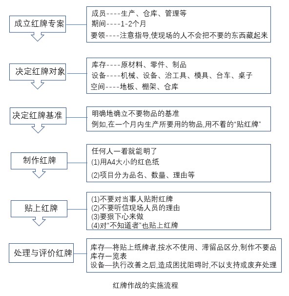 貼附的紅牌移往紅牌集中處后,應(yīng)予以記錄。將貼上紙牌者,按永不使用、滯留品區(qū)分,制作不要品庫(kù)存一覽表,對(duì)于設(shè)備-執(zhí)行改善之后,造成困擾阻礙時(shí),不以支持或廢棄處理。紅牌作戰(zhàn)看板流程具體細(xì)節(jié)內(nèi)容如上圖所示。